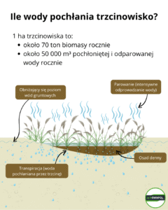 Przykład: Trzcinowisko o powierzchni 1 hektara i produkcji około 70 ton biomasy rocznie, w trakcie jednego sezonu wegetacyjnego pochłania nawet 50 000 m³ cennej wody, co ma znaczący wpływ na obniżenie poziomu wody nie tylko w samej niecce, ale również poziomu wód gruntowych na terenach przyległych.